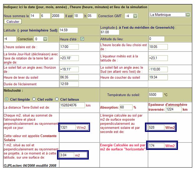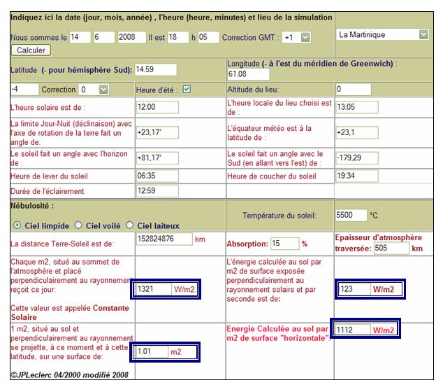 Les cases vertes sont des cases modifiables, la modification de leurs contenus est prise en compte dans les calculs; ces derniers se mettent à jour par un "clic" sur n'importe quel endroit du tableau. ou sur "Calculer" Les cases blanches sont des cases calculées, la modification de leurs contenus est sans effet. Correction GMT (Case A): Il s'agit de la correction par rapport au méridien de Greenwich du lieu où est implanté l'ordinateur. Par défaut, il s'agit du fuseau horaire de la France Métropolitaine. Choix de la ville "cible" (Case B): Pour choisir une ville dont on veut connaître le flux solaire, il suffit de sélectionner une ville dans la liste déroulante Fuseau horaire de la ville "cible" (Case C): Il s'agit du fuseau horaire de la ville cible (+1 pour les villes de la France métropolitaine) Correction fuseau horaire (Case D): Certaines villes ont une heure locale qui ne correspond pas à celle de leur fuseau horaire, cette liste déroulante permet d'effectuer une correction. Choix de la nébulosité (Case E) : Permet de mettre en évidence "la qualité" de l'atmosphère dans le flux reçu au sol. Choix de la température de la photosphère (Case F) : Permet de montrer l'influence de la source (le soleil) sur le rayonnement reçu
