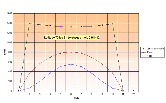 Exemple1 : Flux énergétique pour le journée du 19/04/2000 à Challans Latitude:46.53N Longitude1.53W Des relevés de la constante solaire, de l'énergie captée perpendiculairement au rayonnement, de l'énergie captée par m2 de sol ont été effectués toutes les heures à Challans, le maximum d'énergie reçue se situe vers 14h30 correspondant au 12h solaire (heure d'été): variation du flux solaire dû à la rotation de la Terre. Exemple2 : Flux énergétique reçue tous les 21 de chaque mois, à 12 heures solaires, à La Guadeloupe. L'énergie reçue au sol est pratiquement égale à celle captée par une surface placée perpendiculairement au rayonnement pendant les mois de mai, juin, juillet et aout: Recherche d' explications: le soleil est pratiquement à la verticale ce qui peut être vérifié en plaçant sur le graphe, au dessus de chaque point, l'angle que fait le soleil par rapport à la verticale. Influence de l'épaisseur d'atmosphère traversée: vérifier en indiquant sur le graphe les épaisseurs. Influence des saisons, expliquer le "creux" observé au mois de juin en indiquant sur le graphe la position de l'équateur météo, compléter éventuellement par l'observation d'images Météosat. Expliquer l'allure de la courbe "Constante solaire". Exemple 3:Flux énergétique reçue tous les 21 de chaque mois, à 12 heures solaires, à une latitude de 70°. Mise en évidence de l'hiver polaire (novembre, décembre), un travail analogue peut être effectué à la latitude -70°. Exemple 3:Flux énergétique reçue au sol , les 21 /06 et le 21/12, à 12 heures solaires pour toutes les latitudes.
