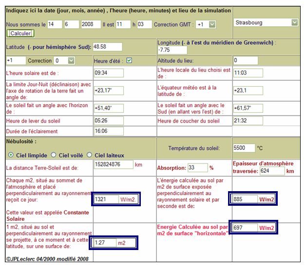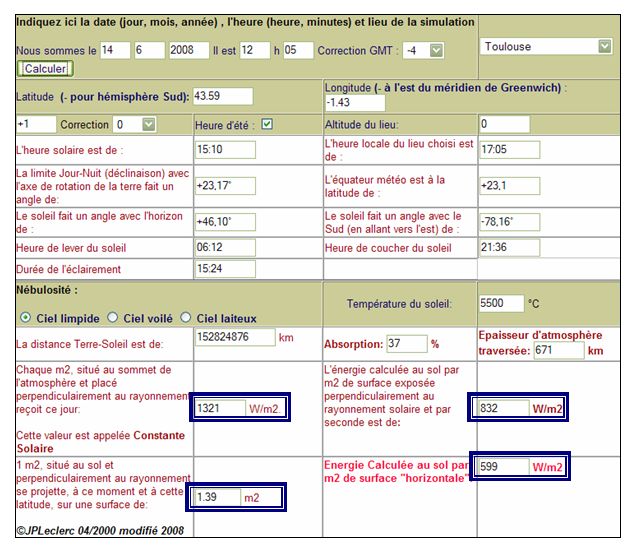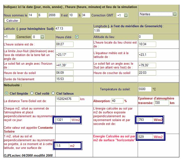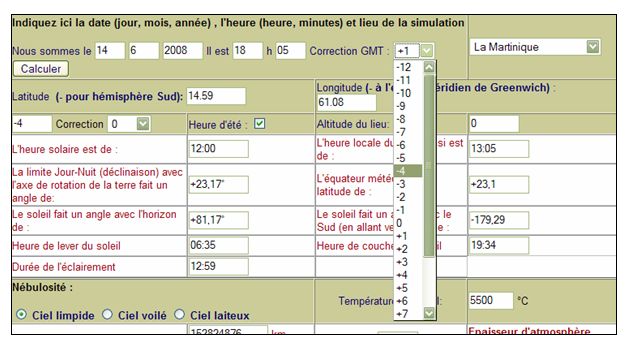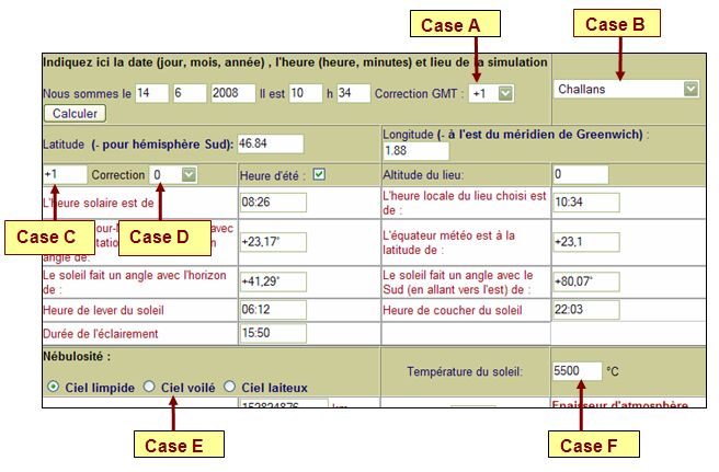 Correction GMT (Case A): Il s'agit de la correction par rapport au méridien de Greenwich du lieu où est implanté l'ordinateur. Par défaut, il s'agit du fuseau horaire de la France Métropolitaine. Choix de la ville "cible" (Case B): Pour choisir une ville dont on veut connaître le flux solaire, il suffit de sélectionner une ville dans la liste déroulante Fuseau horaire de la ville "cible" (Case C): Il s'agit du fuseau horaire de la ville cible (+1 pour les villes de la France métropolitaine) Correction fuseau horaire (Case D): Certaines villes ont une heure locale qui ne correspond pas à celle de leur fuseau horaire, cette liste déroulante permet d'effectuer une correction. Choix de la nébulosité (Case E) : Permet de mettre en évidence "la qualité" de l'atmosphère dans le flux reçu au sol. Choix de la température de la photosphère (Case F) : Permet de montrer l'influence de la source (le soleil) sur le rayonnement reçu