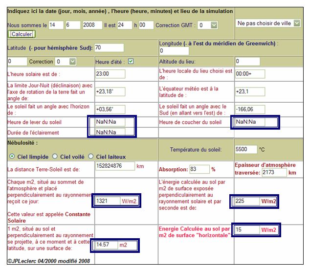 Mon ordinateur est en France Métropolitaine et j'effectue une simulation sur une ville imaginaire située à la longitude de Greenwich et à une latitude de 70°(Cercle polaire Nord). Je sélectionne dans la liste déroulante (case B) "Ne pas choisir de ville", je paramètre la case Latitude à +70 et la case Longitude à 0. A minuit, sur le cercle polaire, le soleil est encore au dessus de l'horizon (+03°56), il est au Nord (+166,06° avec le sud), les heures de lever et de coucher sont indéterminables (NaN:NaN) puisque le soleil ne se couche pas: c'est l'été polaire.