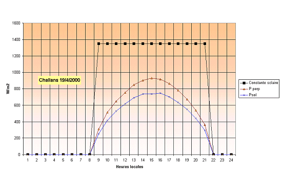 Exemple1 : Flux énergétique pour le journée du 19/04/2000 à Challans Latitude:46.53N Longitude1.53W Des relevés de la constante solaire, de l'énergie captée perpendiculairement au rayonnement, de l'énergie captée par m2 de sol ont été effectués toutes les heures à Challans, le maximum d'énergie reçue se situe vers 14h30 correspondant au 12h solaire (heure d'été): variation du flux solaire dû à la rotation de la Terre.