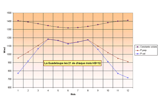 Exemple2 : Flux énergétique reçue tous les 21 de chaque mois, à 12 heures solaires, à La Guadeloupe. L'énergie reçue au sol est pratiquement égale à celle captée par une surface placée perpendiculairement au rayonnement pendant les mois de mai, juin, juillet et aout: Recherche d' explications: le soleil est pratiquement à la verticale ce qui peut être vérifié en plaçant sur le graphe, au dessus de chaque point, l'angle que fait le soleil par rapport à la verticale. Influence de l'épaisseur d'atmosphère traversée: vérifier en indiquant sur le graphe les épaisseurs. Influence des saisons, expliquer le "creux" observé au mois de juin en indiquant sur le graphe la position de l'équateur météo, compléter éventuellement par l'observation d'images Météosat. Expliquer l'allure de la courbe "Constante solaire".