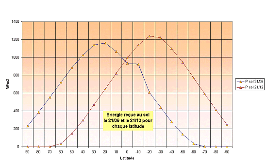 Exemple 3:Flux énergétique reçue au sol , les 21 /06 et le 21/12, à 12 heures solaires pour toutes les latitudes.